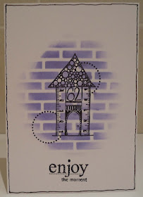 I sponged lilac Brilliance ink through my favourite Stamposaurus bricks stencil. I stamped the Paper Artsy house, masked it and stamped the Hero Arts dots circles. The sentiment is from Unity stamps. It did say 'enjoy - savor the moment' but I cut off the 'savor' as it's an American spelling and I'm English and I just couldn't do it! (I'm a teacher!) Finally I hand-drew a border round the card.