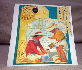 Here I used scraps from Graphic 45 paper left from a project kit from my local crop months ago. The tag was one that at some stage  I distressed, stamped with compasses...and shoved in a bag of scraps! I cut some of the paper into banners and dry embossed the teal card.
