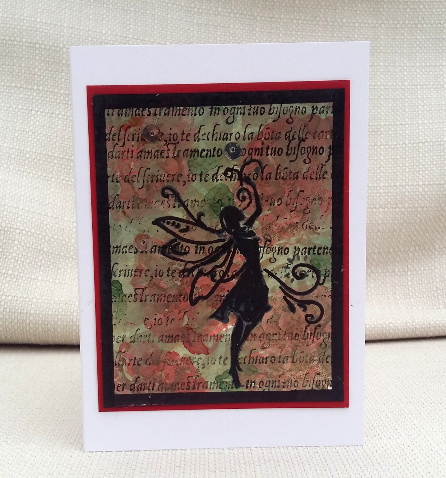 The script stamp is an old unmounted, Brand unknown, and the fairy was an old magazine freebie. There are 3 sequins but they don't show up well in the photo. So, this is not a very illuminating description is it?!
