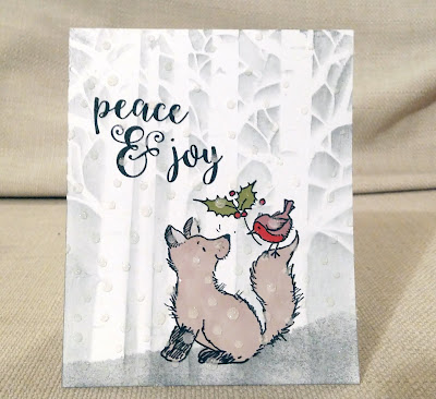 I made a stencil using free clip art that I traced and cut on the Silhouette. I stamped the fox and bird stamp (Penny Black) masked them and stencilled the trees and ground. I coloured the image with alcohol markers and then stencilled snow with texture paste and glitter. It really does sparkle nicely in real life!