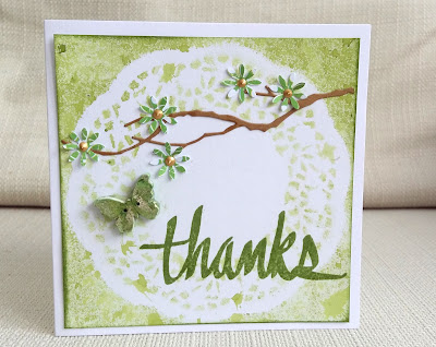 Finally, I made the background for this card by spraying through a doily from my own kit. The resin butterfly ( which I coloured with gold wax and a green powder) and the branch are from Pia and the blossoms were punched from Nonni's paper. I added an Alte New sentiment and gold liquid pearl.