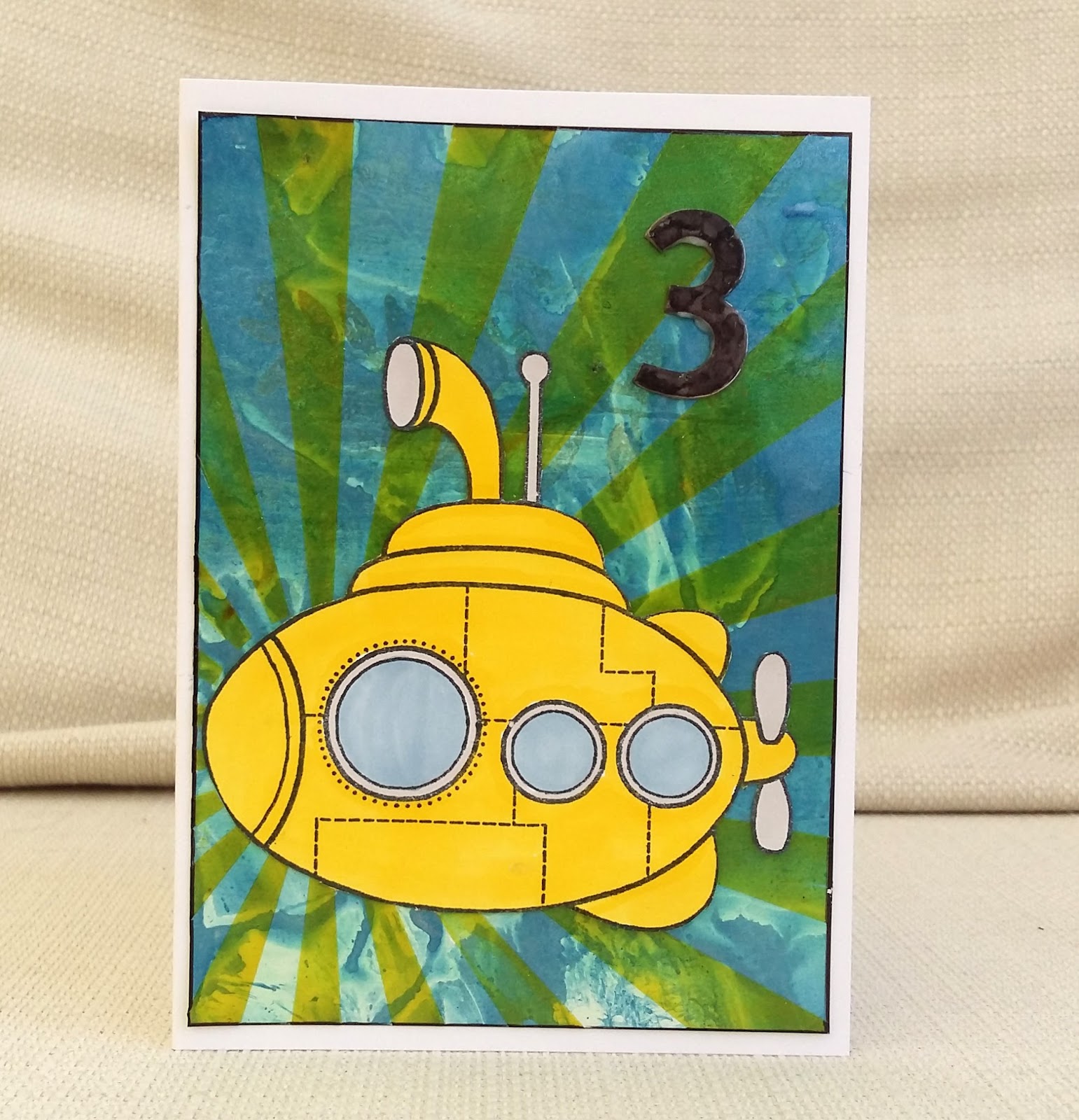 Woo Hoo!! "We all lived in the Yellow Submarine....." Awesome card, love the bright, fun colors and totally fabulous background, perfect card for a little 3 year old.