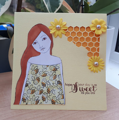 Brilliant cards and such a cute bee! Very clever stamping them on the dress! Hope you have a good day at work. xxx