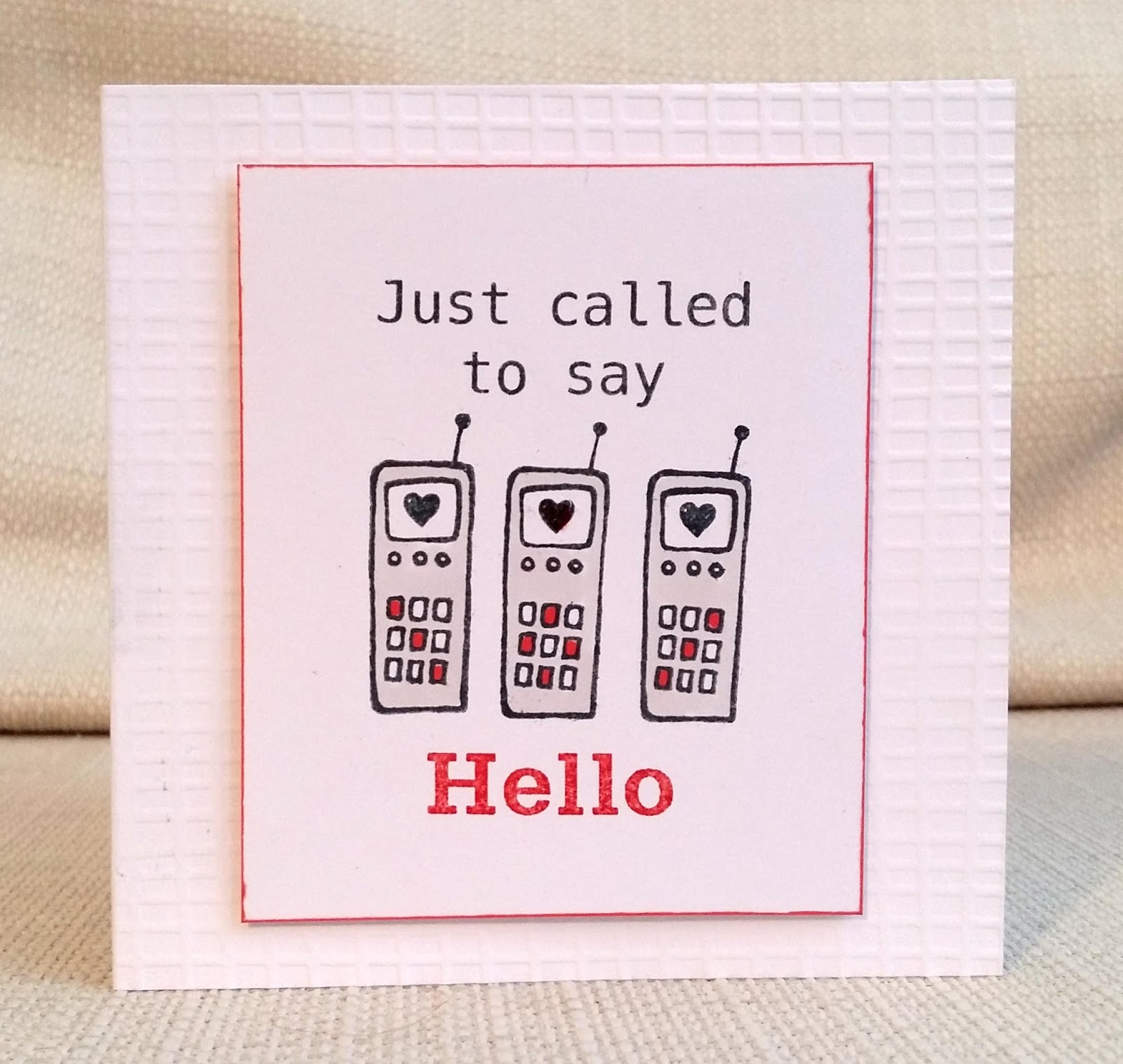 It's the first challenge of the year at City Crafter, and Kirsty wants us to use the word 'hello' on our projects. I used a phone stamp by Sweet Dixie and stamped it three times. 'Just Called to Say' is from the same set, and the 'hello' is Personal Impressions (I think!) .